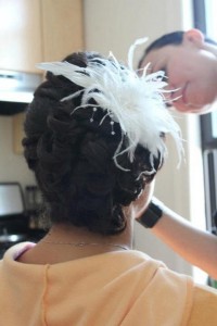 I did the updo on the left, so I know exactly how intricate the design was and in person it was *stunning*. But my client’s hair was so dark that a lot of the detail gets lost in the photographs. Ever notice how most of the popular images of hairstyles on Pinterest feature blondes or brunettes with highlights?